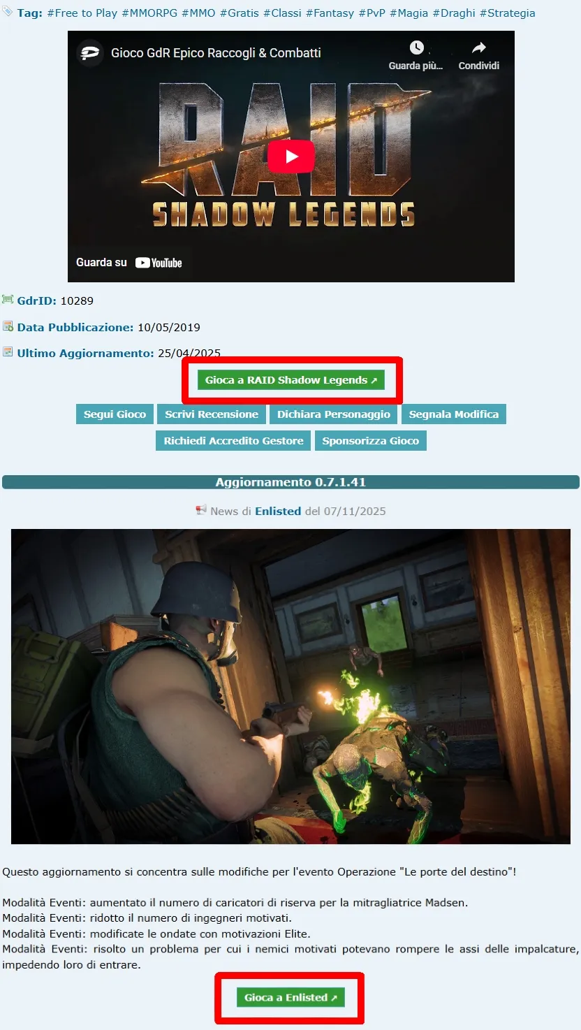 Sulla scheda del gioco e sotto ogni news/annuncio il sistema aggiungerà un tasto con una speciale call to action in verde che invita a provare il gioco! Cliccando sul pulsante l'utente sarà mandato direttamente sulla vostra home page!