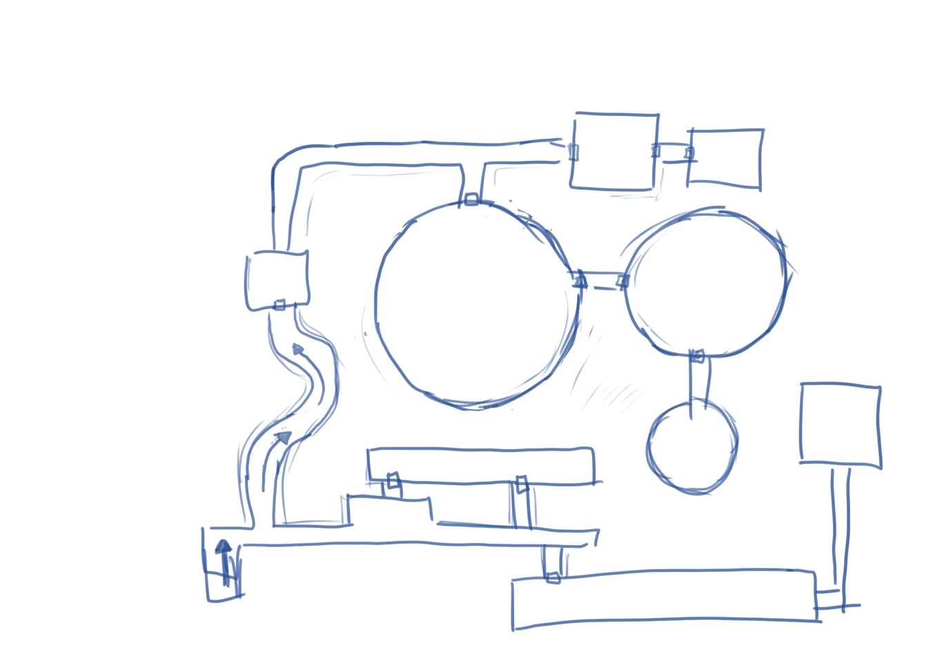 Le forme sono molto rozze, mi interessa solo che mi torni l’idea, inizio a indicare sulla mappa le stanze principali che mi sono venute in mente, corridoi, dislivelli all’interno del piano (di solito uso frecce) che deciderò poi’ se saranno scale o rampe o altro ancora.