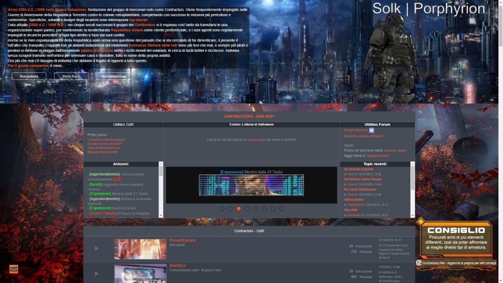 Grazie a voi di questa opportunità! Contractors é un GdR via forum di ambientazione fantascientifica. Si svolge nell'anno 3560: l'umanità è in grado di viaggiare nello spazio da più di mille anni ormai, e la sua progenie si é propagata per il cosmo rapidamente, attirata da quella strada aperta che è lo spazio sconosciuto. Molti dei suoi discendenti sono stati cambiati dai nuovi ambienti incontrati, dalle nuove società fondate, o solo dal tempo: non ci sono più i soli Terrestri, ma si parla di Hyadesiani, Spaziali, Ettyn e molti altri ancora.